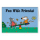 This image from "Maisy Goes to Preschool" (illustrated by Lucy Cousins and published by Candlewick Press) shows Maisy and Dotty enjoying a beautiful day outside. Both characters have huge smiles on their faces as they enjoy the playground seesaw. Insects and flowers add spots of rich colour to this fun image, which will make little ones want to get outside and play, too!