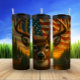 A majestic buck with prominent antlers stands front and centre, its gaze direct. Behind it, a vibrant American flag stretches across the sky, bathed in the warm glow of a sunset over a forested landscape with a calm body of water. Smaller deer are visible in the distance, enhancing the sense of a grand wilderness scene imbued with patriotic symbolism.