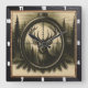 This square wall clock features a striking image of a majestic deer's head framed within a rifle scope's crosshairs, set against a backdrop of towering pine trees. The sepia-toned artwork evokes a classic hunting aesthetic, making it an ideal piece for hunting enthusiasts, lodge decor, or anyone who appreciates the wilderness.