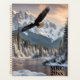 A majestic bald eagle soars over a river in the high country, as snow blankets the earth and trees. Perfect for anyone who loves nature and the outdoors.