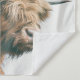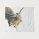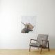 Portrait photograph of a majestic orange brown highland cattle on a foggy day with white background.