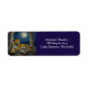 A leopard themed personalized return address labels. On the front is an illustration of a majestic leopard with fur like molten gold, laying on a cliff ledge bathed in ethereal moonlight. Intricate carvings adorn crumbling stone pillars, and bioluminescent flora casts a soft, otherworldly glow. The scene is rendered in a rich, textural oil painting style with thick strokes.