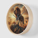A majestic lion stands proudly on a rock in the middle of the African savannah. The scene is dipped in warm, golden light of sunrise or sunset, highlighting the lion's impressive mane. In the background the wide nature stretches with high grasses, isolated acacia trees and gentle, far-reaching hills. The sky shows light clouds that give the scenery an additional depth and atmosphere. The presentation is realistic and detailed, focusing on the textures of the fur and the surrounding area.