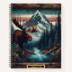 A majestic moose stands proudly near a tranquil river, framed by towering trees and a majestic mountain backdrop, as dawn breaks quietly.