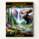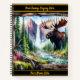 A moose stands proudly near a serene stream, framed by lush pine trees and cascading waterfalls. The vibrant landscape captures the essence of nature's beauty.