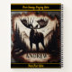 A stunning moose carved into dark wood showcases nature's beauty, surrounded by forests and mountains, evoking a serene wilderness vibe.