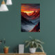 A breathtaking digital painting captures a majestic mountain range bathed in the warm glow of a setting sun. The sky is ablaze with vibrant hues of orange, red, and yellow, casting long shadows across the rugged peaks. The lower slopes are shrouded in a soft, ethereal mist, adding a sense of mystery and tranquillity to the scene.
