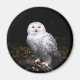 Animal portrait photograph of majestic snowy owl standing on a branch.