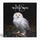 Animal portrait photograph of majestic snowy owl standing on a branch with a personalizable custom name monogram above.