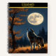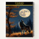 A lone wolf stands tall on a grassy hill, its head tilted back as it howls at the bright full moon illuminating the night sky. Surrounding trees and twinkling stars create a serene and mystical atmosphere, capturing the essence of wilderness at dusk.