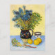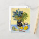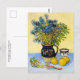 A fine art postcard with the post-impressionist painting, Still Life Majolica Jug with Wildflowers (1888), by Vincent van Gogh (1853-1890). A still life of a stoneware jug with blue wildflowers and lemons against a yellow backdrop.