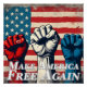 A vivid street-art style image where three bold fists rise against a vintage American flag, echoing a timeless call for freedom, courage, and unity — a visual anthem of resistance and hope.