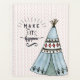 Boho style tepee tent in blue with "Make it Happen" word art overlay on muted polka dot background