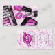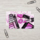 Makeup artist business card design with pink lipstick, eye shadow palettes and nail polish over shiny pink-white background covered with glitter. This stylish profile card is perfect for beauticians, cosmetologists, hair and makeup beauty salons and other similar professions. If you need any help with this design, feel free to contact me.