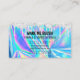 platinum silver simulated glitter drips melting down from the top on both the back and front, and a metallic faux foil Iridescent Opal rainbow holographic texture set the tone for this customizable business card template, featuring a bottom border of sparkling platinum silver ice glitter beauty products on its face.