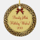 A wonderful unique digital art makeup themed Christmas Holiday ornament! This round double sided ceramic ornament features a lovely digital art image of a Christmas or Holiday tree with a lipstick and two makeup brushes on front. It is framed with trendy cheetah animal print art border with golden digital art trimmings, topped off with a red and gold bow! The back of the ornament reads "Beauty filled Holiday Wishes" in a festive red script font. Add the year for the final touch! It's a beautiful makeup themed ornament for someone who loves makeup! Great from or for a makeup artist! For more makeup themed holiday cards and gifts please visit our shop!