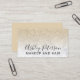 An elegant modern, stylish makeup artist business card with elegant modern simple hand lettering style typography in white on a faux light gold glitter and white marble trendy and elegant background. all text is customizable, add your social media.