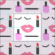A cute makeup design, featuring red lipstick, lips, a purple eyeliner pencil, false eyelashes, and pink nail polish.
