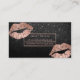 An elegant modern, stylish and simple makeup artist business card with elegant script hand lettering style typography with faux rose gold frame and lips on stylish faux black glitter ombre background. A simple and professional design