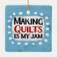 "Making Quilts Is My Jam" is a cute text design in blue with black and red text, along with a white accent shape and white textured whimsical dots surrounding it.