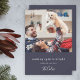 A stylish modern holiday photo flat greeting card with a classic typography quote "making spirits bright - with love at christmas" paired with a handwritten script font for your family name in white with a navy blue feature colour in a 'scandi' scandinavian design style. The greeting and name can be easily customized for a personal touch. A trendy, minimalist and contemporary design to stand out this holiday season! The image shown is for illustration purposes only to be replaced with your own photo. The placeholder image is of a young couple in fair isle christmas sweaters and a cute little white dog in thier festive home at christmas.
