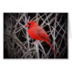 Bright red male Cardinal bird is perched in a bush with little branches all around.