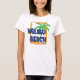 Orange art frame around green palm tree, bold blue Malibu Beach text, an unusual design that's a true original not found in malls or boardwalks. Southern California lifestyle on a t-shirt! Malibu Beach in ocean deep blue text, grassy green palm tree behind sunshine orange contemporary artistic frame. Another original from Malibu Tees!