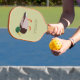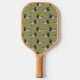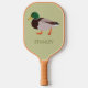 Create a personalized gift that's perfect for pickle ball players who are also bird lovers when you add their name to this pickleball paddle. It features a realistic style illustration of a male mallard duck in green and brown against a pale green background with a name or other text in coordinating olive green lettering. The reverse side has a matching pattern of ducks and stripes.