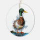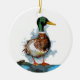 traditional watercolor painting of a male mallard duck with green and brown feathers on a ceramic ornament.