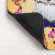 This mousepad features an illustration of a cute little Maltese poodle mix puppy in a seated pose set against an orange background with a pattern of pink and orange butterflies.