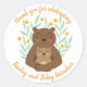 A sweetly illustrated mama and baby bear are flanked by mint green leaves and sunny yellow flowers to look cheerful on this custom baby shower sticker perfect for any party decor need.