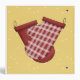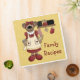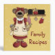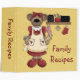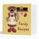 A country cloth yellow background, a country art kitchen shelf with kitchen utensils, and a mama bear in a red dress and cream apron carrying a sugar shaker and a rolling pin. A cute, whimsical design to collect all your secret family recipes in! The perfect gift from a mom to her daughter or daughter in law!