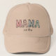 Customizable MAMA trucker hat featuring doodle letters with watercolor backgrounds and editable text field.