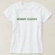 T-shirt vert clair avec le logo "MAMAN FORTE" à travers l'avant. Le dos est vide. Le lettrage est dans un type police foncé de camo de vert olive.