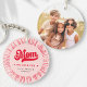Clavier avec texte personnalisable "Maman, on t'aime", petits coeurs rouges et noms d'enfants à l'intérieur d'une bordure rouge et rétro sunburst. Photo personnalisable sur le dos. Arrière - plan de couleur rose ou personnalisé.