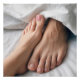 A woman's foot and a man's foot are seen touching each other on a bed, partially covered by soft, white sheets