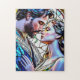This stunning piece captures a beautiful moment between two individuals through vibrant colours, bold shapes, and intricate details reminiscent of stained glass artistry.