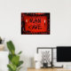 Man Cave art painting in red to black colors with lit torches on each side. Man art for his cave. Features a cave wall with early mans signature similar to what a cave man painting. Art for an underground dwelling or dweller where men hang out and do manly things