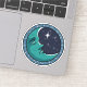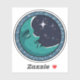Blue crescent moon with the face of a sleeping man in a starry night sky. Part of his face is lit up by a bight white shining star. The design is set inside a blue circle border with small white and blue dots.