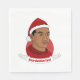 Paper napkins with illustration of a African American or Hispanic man with short black hair and red Santa Claus hat; in red circle on a white background, with customizable text template for your name or message