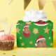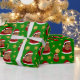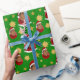 Christmas wrapping paper with illustration of a African American or Hispanic man with short black hair and red Santa Claus hat; in red circle on a green background with stars, with customizable text template for your name or message