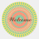 Welcome stickers - Design of beautiful, colourful mandala pattern in green orange and yellow with Welcome logo. This design is set against a pale yellow background and has an ethnic feel.