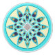 Twelve point mandala pattern in shades of turquoise, tan, navy, beige and grey on a turquoise background