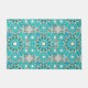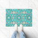 Doormat in a twelve point mandala pattern in turquoise, blue, white, and shades of grey / grey on a pale, silver grey background
