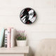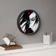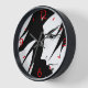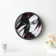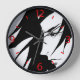 Manga character wall clock with a manga style black and white illustration of a male character's face with wind blown hair and red numbers. This stylish clock would make a great gift for someone an anime / manga fan.