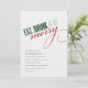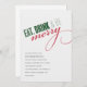 Cette invitation de fête de vacances comprend les mots "manger, boire et être joyeux" dans la typographie moderne élégante. Les mots sont en vert et rouge et l'invitation est posée sur un arrière - plan blanc. Les détails de votre pièce sont affichés ci-dessous en texte gris
