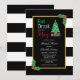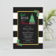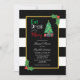 Mangez, buvez et soyez joyeux invitation à la douche nuptiale de Noël avec un arbre de Noël et des cadeaux contre un cadre d'or. Arrière - plan rayé noir et blanc avec saint