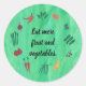 Ces autocollants présentent ma peinture de divers fruits et légumes dans un agencement de face d'horloge. Le texte au centre dit, Mangez plus de fruits et légumes. Les fruits et légumes comprennent des oranges, des bleuets, des concombres, des cerises, des bananes, des haricots verts, des carottes, des tomates, des asperges, des radis, des patates douces et des épinards. L'arrière - plan est mélangé vert. Merci pour faire du shopping CherylsArt sur Zazzle.