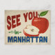 A charming Manhattan Kansas vintage travel postcard featuring a lovely red apple, along with fun retro style text that says, "See you in Manhattan"