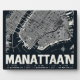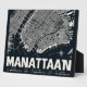 The stylized black and white map illustrations of the Manhattan area in New York City.